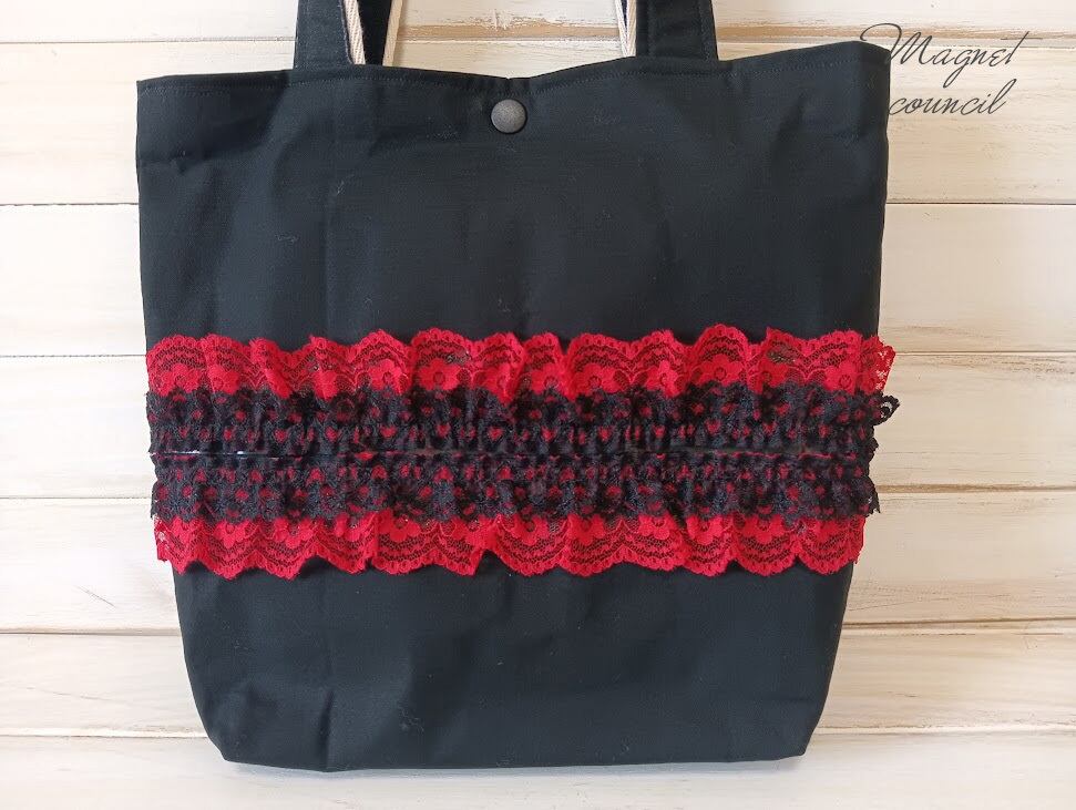 黒無地に赤と黒の幅広レースリボンを中央に張り付けました。