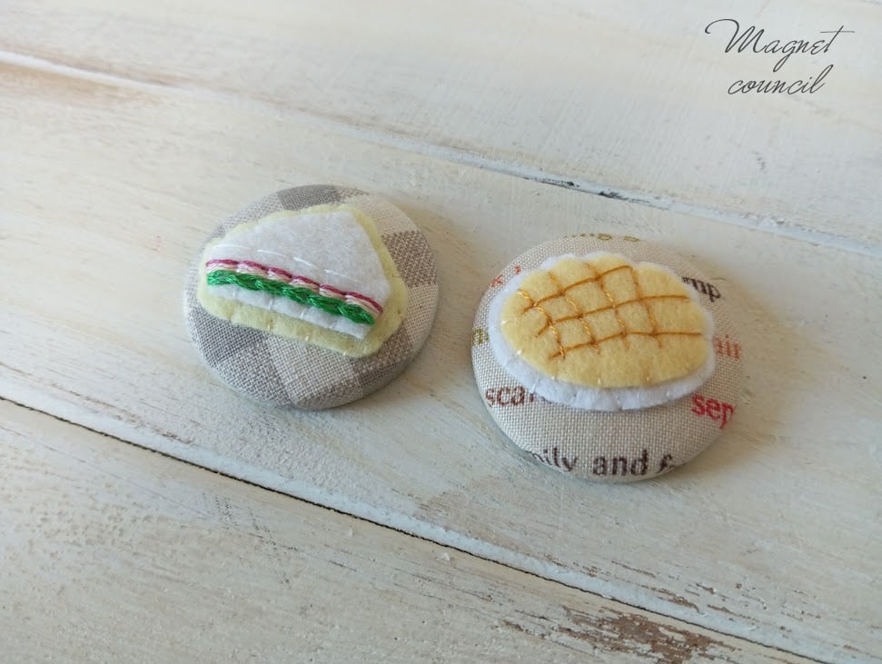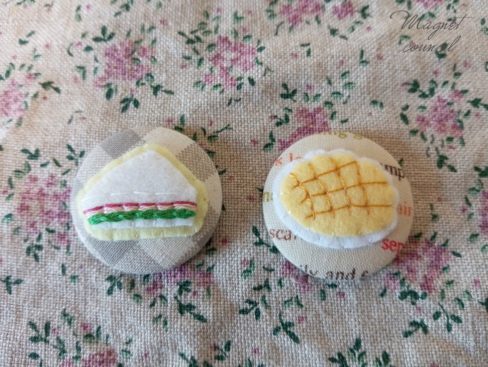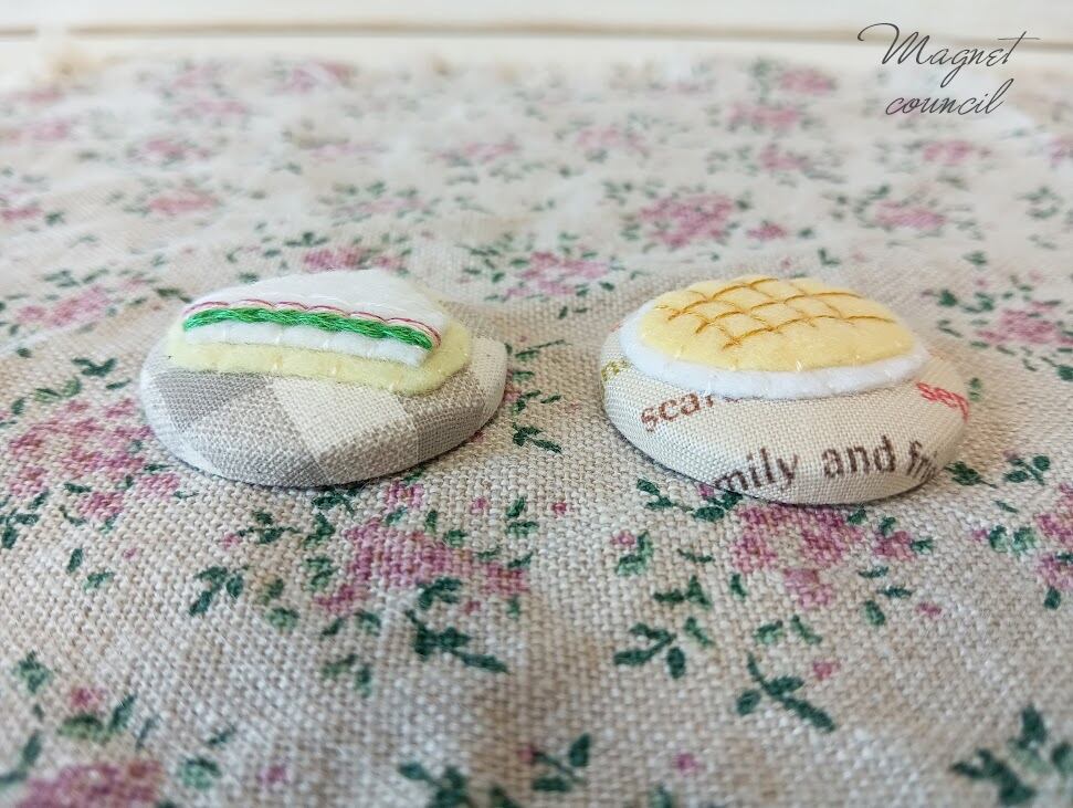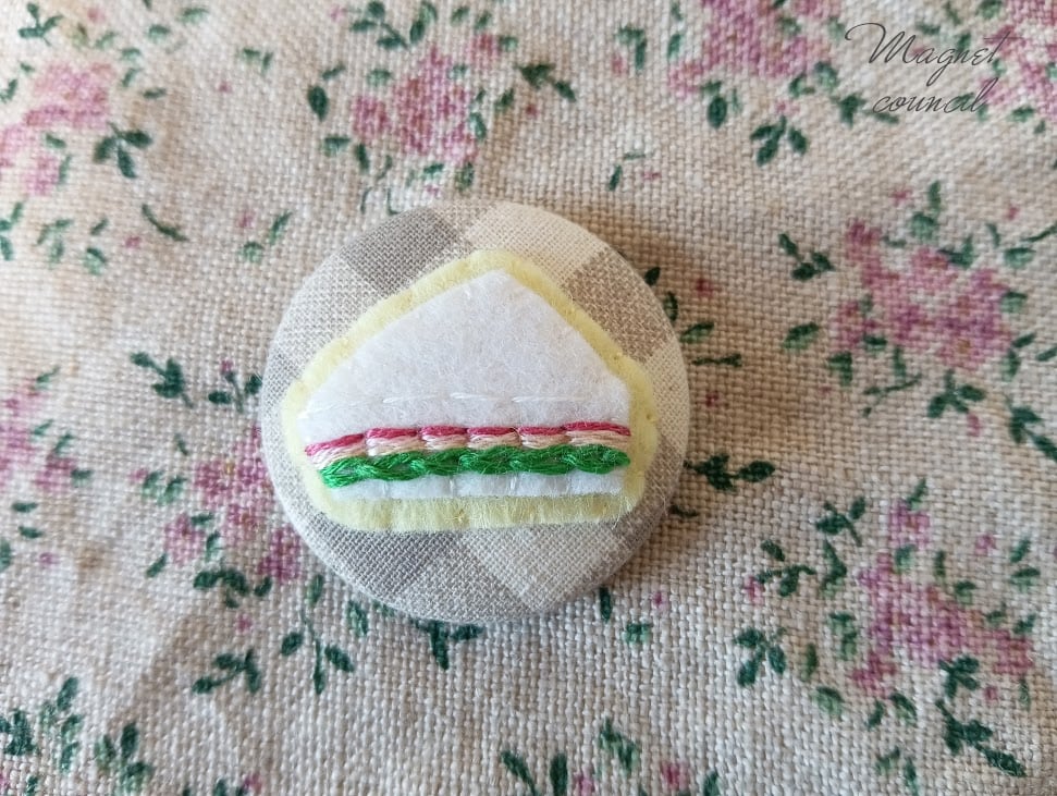 カットクロスにアップリケを施し、くるみボタンへ添付しています。