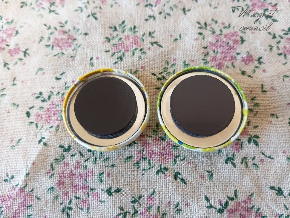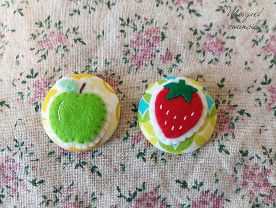 カットクロスにアップリケを施し、くるみボタンへ添付しています。