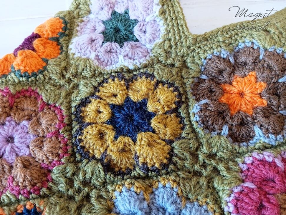 カラフルな毛糸で編んだアフリカンフラワーモチーフのバッグです。