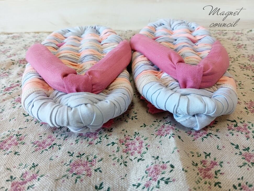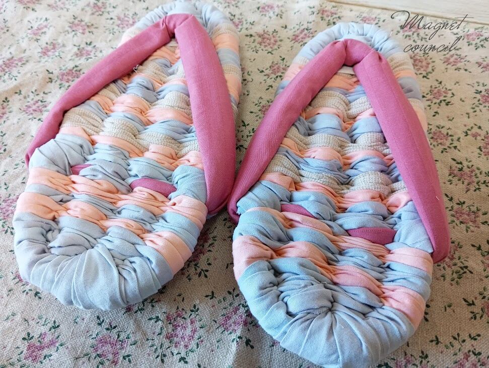 *布草履に足が入りにくい場合、鼻緒の真ん中の紐(前緒)を手でつまんで引っ張り上げるとスムーズにはいります。
