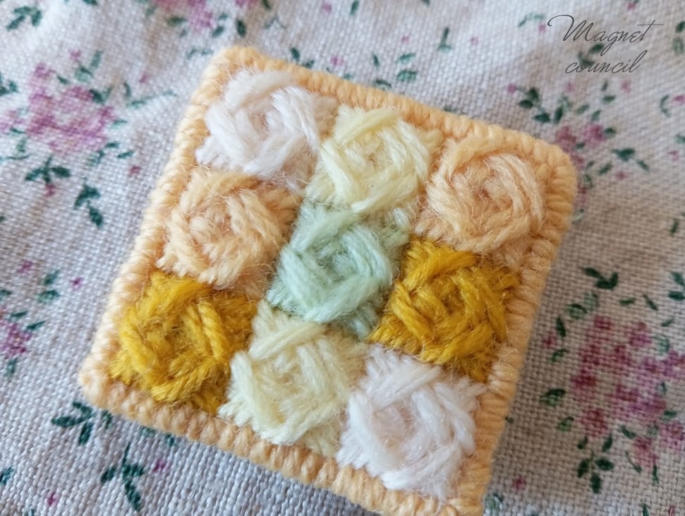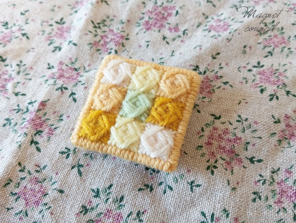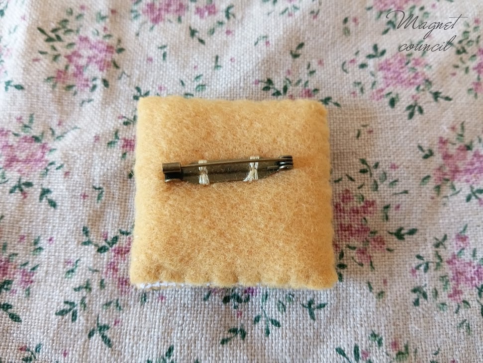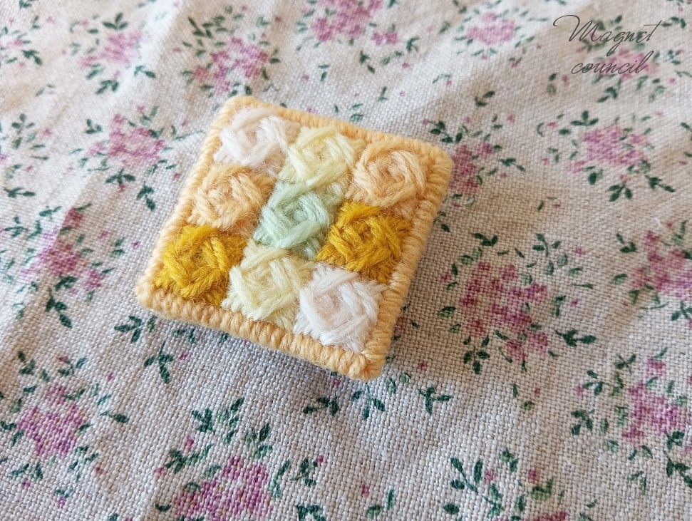 刺繍用キャンバス、ウール刺繍糸、フェルト(裏地)、キルト芯(中綿)、ブローチピン