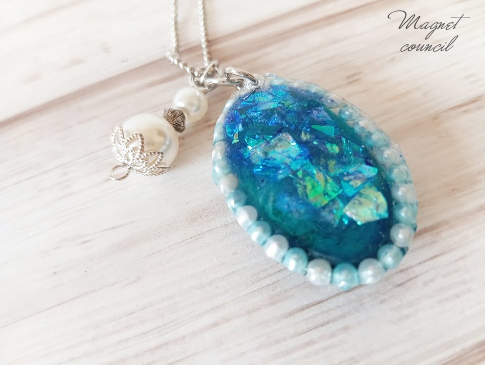 オーバル型のレジンの中には、光を反射して複雑に輝くホログラムを何層にも重ねました。