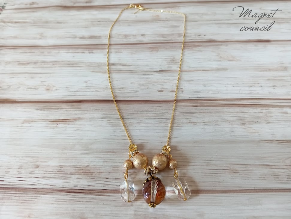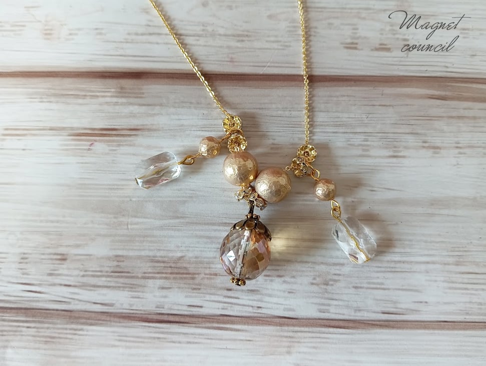 落ち着いたグレージュカラーとゴールドの輝きが、大人の上品さを引き立てる「ソワグレージュネックレス」です。