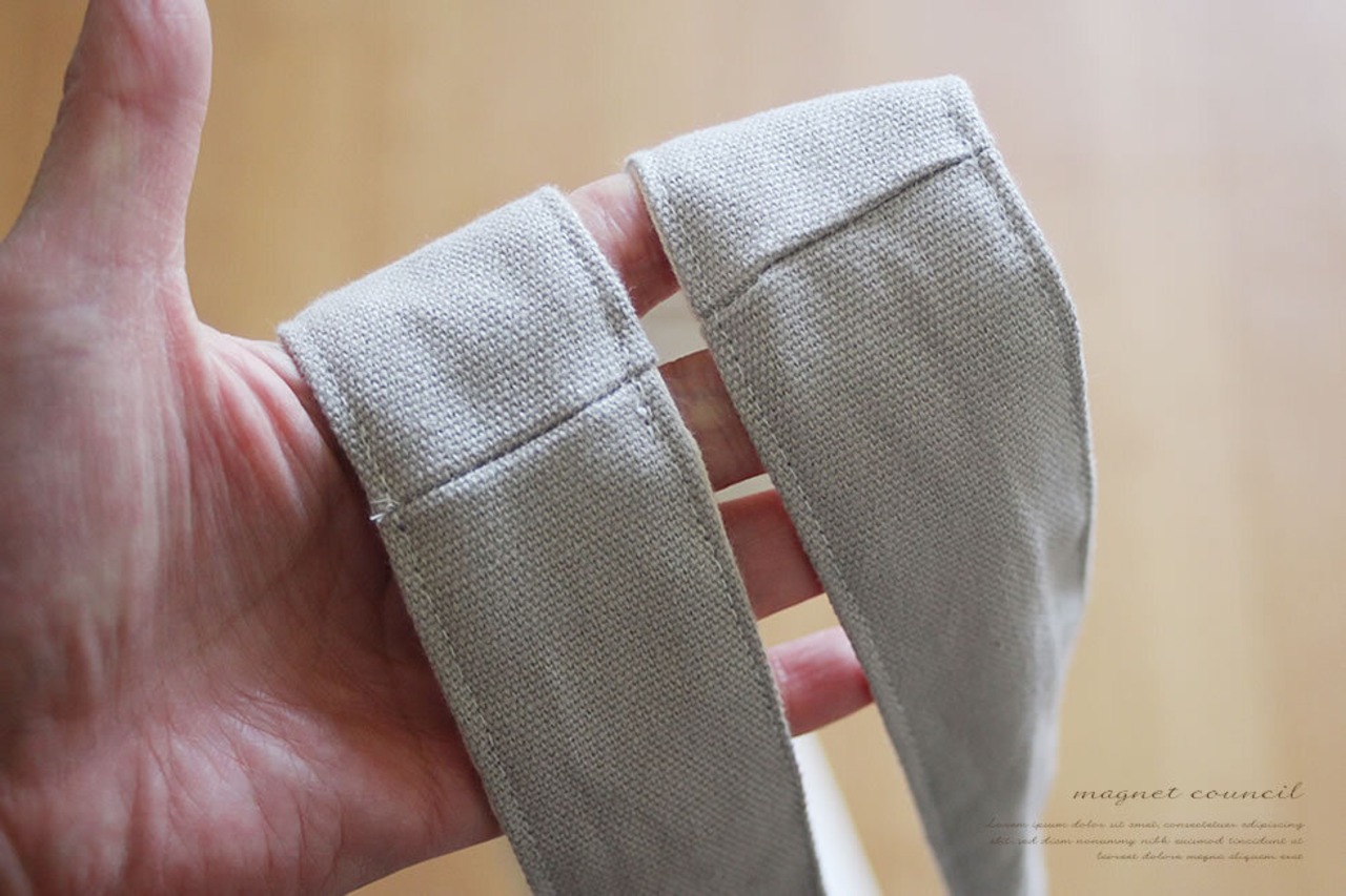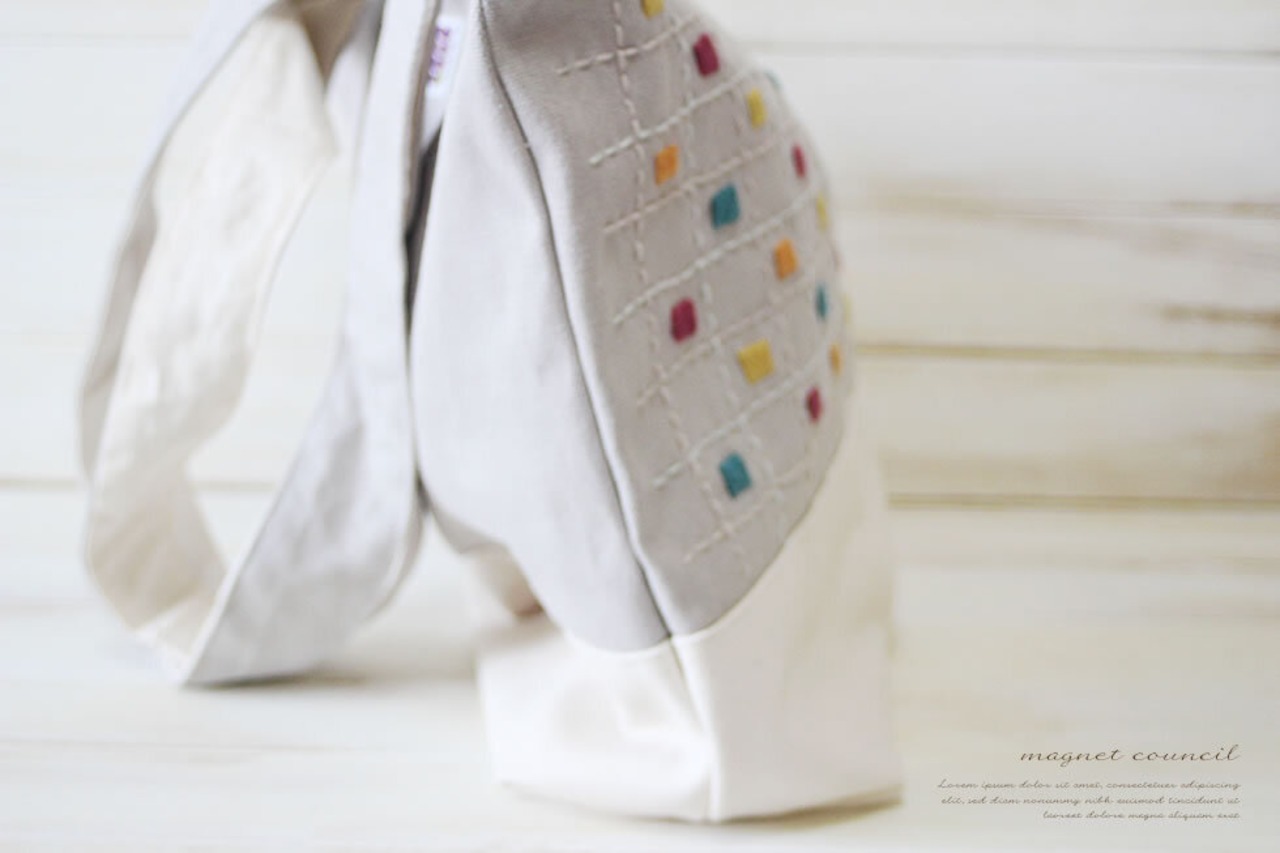 片面それぞれタグ、刺繍で雰囲気をかえています。